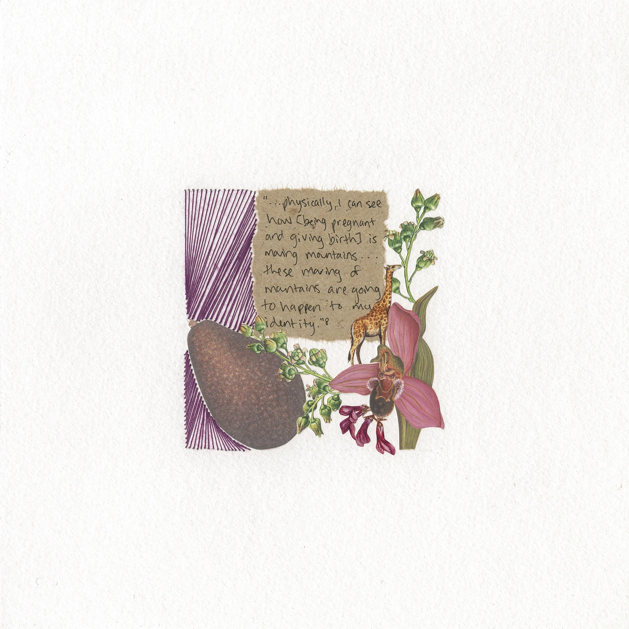 While drawing on themes of pregnancy and womanhood, the concept of tending produce began with an exploration of the baby size food chart – a popular visual aid used by pregnant women during the average 40-week gestation period. Usually in the form of a mobile app, the chart helps women envision fetal development using various fruits and vegetables as comparisons. Beginning at week two and continuing every two weeks until week forty, each collage in this 20-piece grid contains a careful selection of imagery, mimicking how a baby grows while gradually filling more and more physical and mental space within the body. Interspersed throughout the piece are quotations from a variety of sources that have influenced me throughout this intimate and profound female experience. The inclusion of written and spoken words represents my attempt to understand what is happening to my body, and how pregnancy is viewed and understood by society. tending produce is simultaneously a personal visual journal and an homage to other women who are familiar with pregnancy. The piece not only engages with the concept of gathering through the acts of collecting paper material and information, it also engages with the concept of gathering because it evokes a sense of community and shared experience.
